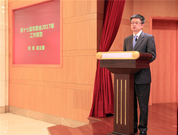 副主委周锋受第十七届常委会委托,做了常委会2017年工作报告。报告从思想建设、宣传和理论研究、参政履职、组织建设、社会服务和机关管理等六方面总结了一年工作,提出了2018年主要工作。报告号召各级组织以中共十九大精神为引领,贯彻落实社十一大提出的各项任务,坚持学习与实践相结合,思想教育与发挥作用相统一,增进政治共识与提高履职实效相促进,不忘初心,牢记使命,不断开创各项工作新局面。
