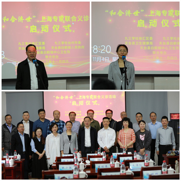 台州市政协副主席、九三学社台州市委主委李立飞,九三学社徐汇区委副主委兼秘书长周梅婴出席“和合济世”联合义诊活动启动仪式并分别致辞。天台县卫健局党委委员、副局长陈新主持仪式。九三学社徐汇区委副主委卢蕴华,九三学社上海市委原社会服务部部长阎凌云,天台县卫健局党委书记、局长吴笑华,天台县白鹤镇人民政府卫健办主任庞梦楚,天台县白鹤镇中心卫生院院长陈明杨,九三学社徐汇区委部分委员、支社主委及医疗专家等十余人参加活动。