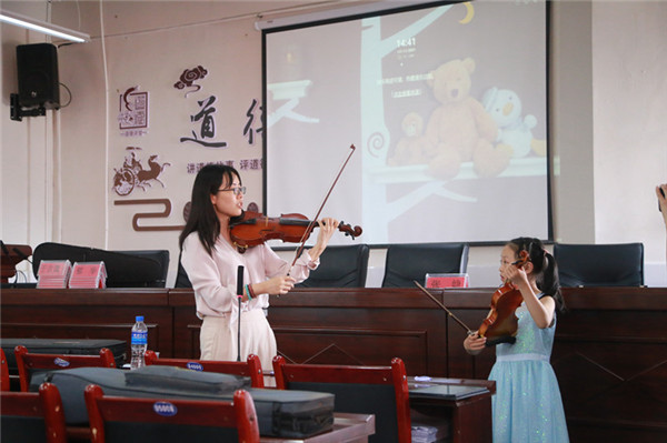 图:得知培训中有专业的小提琴老师,孙艺瑶妈妈特地带着小朋友来到现场求教,为了能让工作坊培训效果更佳,张婕老师坚持要给艺瑶示范。为了借一把小提琴,大家跑遍了整个威宁县城,终于偶遇一个老年乐团正在活动,大家怀着忐忑的心情去借小提琴,老同志欣然答应,也来到了工作坊,一起在音乐的世界里遨游。