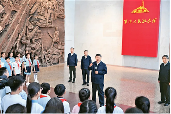 2025年7月7日至8日,中共中央总书记、国家主席、中央军委主席习近平在山西考察。这是7日下午,习近平在位于阳泉市狮脑山的百团大战纪念馆考察时,同前来参观的青少年学生和纪念馆工作人员亲切交流。 新华社记者 殷博古/摄