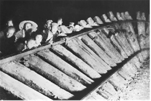 1944年,抗日军民在敌后破袭战中携手掀翻山西忻州南同蒲铁路路段枕木。新华社发(李峰 摄)