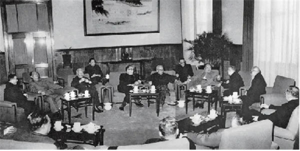 1964年2月,毛泽东邀集党内外人士在人民大会堂召开教育工作座谈会,前排左起:许德珩、彭真、刘少奇、郭沫若、邵力子、毛泽东、黄炎培、陈叔通