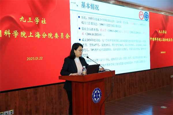 1月22日,九三学社中国科学院上海分院委员会2024年度工作总结会在中国科学院上海分院顺利召开。社上海市委副主委、中国科学院上海分院委员会主委苏良碧出席并讲话,市科技工作党委统战处处长曲介庸、三级调研员杨莹,中国科学院上海分院党建工作处(纪检办公室)处长过宣帆应邀出席。委员会副主委于广辉、龚继明、陈凡胜,委员会委员、下属支社主委、退休社员代表、新社员代表等近四十人参加,会议由于广辉主持。