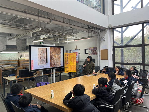 活动伊始,创新中心郭霄楠老师带领孩子们参观了中心的非遗陈列,详细介绍了上海彩灯、皮影彩绘、扎染、彩绘、木艺、金器等多种非遗手工艺品,让孩子们沉浸在传统工艺的世界中。随后,秦川老师以“消失的秘符——中国传统纹饰符号解析”为题,为孩子们带来了一场精彩的专业讲座,使他们对中国传统纹饰有了更深入的了解。