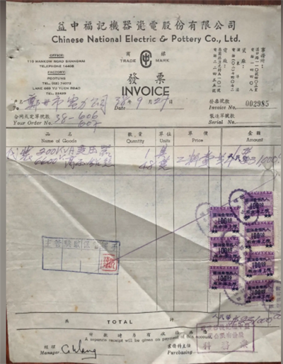上海益中福记机器瓷电股份有限公司,地址位于上海汉口路。发票上方分别用中英文介绍公司名称地址及电话号码。公司经营有电厂、瓷厂二家工厂,票面贴有七张加盖印章的印花税税票。